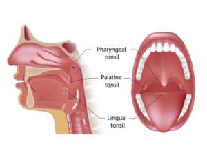 Most people don’t give much thought to their tonsils. Hidden in the back of the throat, these tiny organs are out of sight and out of mind. Often, it isn’t until something goes wrong with their tonsils that people pay them much mind. They were even once thought to be vestigial structures. Tonsils, however, are more than meets the eye. In this article, we will review the tonsils’ function and anatomy, relevant health conditions, and more. Quick Facts About Tonsils Tonsils are part of the immune system and help detect pathogens Located in the back of the throat within the pharynx Made up of mucosa-associated lymphoid tissue (MALT) Include four types: palatine, pharyngeal (adenoids), lingual, and tubal Common conditions include tonsillitis, tonsil stones, and peritonsillar abscess In some cases, surgical removal (tonsillectomy/adenoidectomy) may be necessary What Do Tonsils Do? Tonsils are a group of tissues that serve as the body’s first line of defense against pathogens entering through the nasopharynx and oropharynx, which are tubes that connect your nose and mouth to your throat.[1] This collection of tissue is known as mucosa-associated lymphoid tissue (MALT). MALT has a specific and important role in helping the body fight infection. How Tonsils Support the Immune System Its primary function is to participate in the secondary immune system by sampling antigens and local pathogens that enter the mouth and nose and stimulate further immune response.[2] Anatomy of the Tonsils Understanding where tonsils are located and how they are structured helps explain their role in protecting the body. Types of Tonsils and Their Location The body has four different types of tonsils all located in the pharynx, which is the upper part of your throat located behind your nose and mouth.[3] Palatine Tonsils: Most people are familiar with the palatine tonsils. This fleshy, oval-shaped pair sits far in the back of the throat on either side of the uvula. It is the only set you can see without assistance.[4],[5] The Pharyngeal Tonsil: a single tonsil also known as the adenoid, is located in the nasopharynx above and behind the soft palette. Lingual Tonsils: The third set of tonsils, which are located at the base of the tongue, are the body lingual tonsils. Tubal Tonsils: Finally, tubal tonsils are set in the nasopharynx wall near the opening to our eustachian tubes, which connect the middle ear with the nasal-sinus cavity.[1] What Is Waldeyer’s Ring? Together, these tonsils form a circular band at the back of the throat called Waldeyer’s ring. Their unique ringed arrangement allows them to effectively guard the entrance to the digestive and respiratory systems, two of the body’s most important systems that interact with the outside world.[5]–[7] Normal Size and Appearance Healthy palatine tonsils are pink or red in color and don’t take up much room in the throat.[4] While their size might vary slightly across the general population, most end up being about the size of a lima bean in adulthood.[1],[3],[8] Tonsil Structure (Crypts and Surface) One characteristic that does not change across the lifespan is their irregular surface. Some people might be surprised to find that ridges and small “holes” called crypts line their tonsils. These folds are typical and naturally occurring. However, it is this anatomical structure, as well as their role in the immune system, that makes the palatine tonsils and adenoid susceptible to infection. Common Tonsil Conditions Redness and inflammation are two trademark signs that the palatine tonsils are infected by a virus or bacteria.[1],[3],[5]–[8] Sometimes, adenoids become infected and swell simultaneously. These symptoms can cause significant pain and even obstruct breathing and swallowing. While several conditions can affect this organ, tonsillitis, tonsil stones, and peritonsillar abscesses are the most common. Tonsillitis What Is Tonsillitis? Tonsillitis is a generic term that describes swelling of the palatine tonsils.[6]–[11] It is the most common condition affecting these organs and is more common among children than adults.[3],[5],[10] About 70 percent of these cases are caused by viruses, such as the flu and the common cold, but bacterial infections can also cause the tonsils to swell.[1],[9] Symptoms Inflammation and redness are the most common signs of tonsillitis, but other symptoms, including throat and ear pain, swollen glands, fever, bad breath, chills, and a white or yellow coating on your tonsils, can also be present.[11],[12] Types These cases fall into three categories: acute (isolated cases where symptoms last between 3–14 days), recurrent (multiple cases per year), and chronic (cases where symptoms last more than 14 days).[1],[3],[9]–[14] Treatment Treatment for tonsillitis often depends on the severity of frequency of infection. Most cases can be treated at home with salt water or medicated gargles, over-the-counter pain medicine, increasing indoor humidity, and drinking warm liquids.[15] A doctor will only prescribe antibiotics when tonsillitis is caused by a bacterial infection, such as strep throat. Tonsil Stones What Are Tonsil Stones? Tonsil stones, or tonsilloliths, are small white or yellow pebble-like lumps that appear on the surface of palatine tonsils. These deposits are typically unilateral, appearing on either the left or right tonsil, and are made up of bacteria, food debris, and minerals, like calcium, that harden and lodge in the ridges and crypts.[13]–[16] Tonsilloliths are relatively common, with most cases occurring in adulthood and people with recurrent tonsillitis.[17] Cases are usually innocuous and sometimes asymptomatic. However, their side effects can be a nuisance. Symptoms The most common symptom is bad breath, but some people also develop a cough, sore throat, or difficulty swallowing.[14],[15],[18] Treatment As with tonsillitis, removing tonsil stones usually does not require visiting a doctor. 